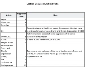 Per quanto riguarda i rappresentanti di società italiane, sono 20 i lobbisti ai quali il governo ha aperto le porta della Cop.